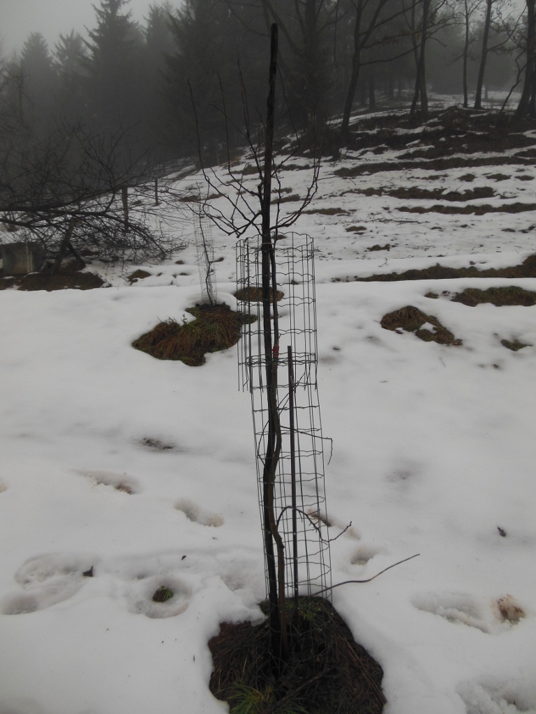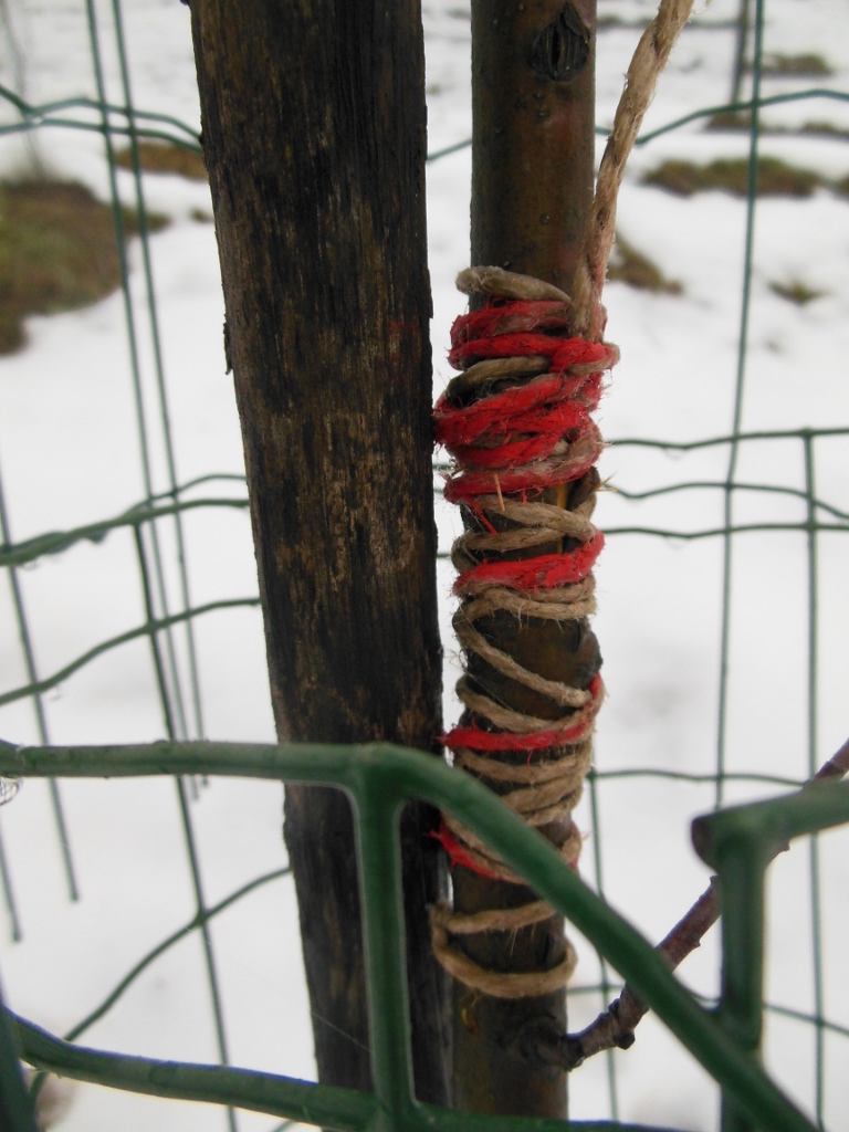 Po otoplitvi ob deblo zapičimo višji kol in drevo privežemo obenj. Če je debelce pri upogibanju počilo, ga izravnamo in trdno povežemo z vrvico. Nato vse skupaj zamažemo s cepilno smolo ali pasto za sadno drevje. Ob deblo zapičimo višji kol in drevesce privežemo obenj. Poleti prerežemo vrvico, da se bo deblo lahko neovirano debelilo. Kambij je že zacelil rano in posledic ne bo.