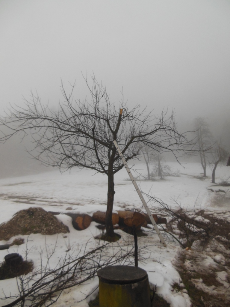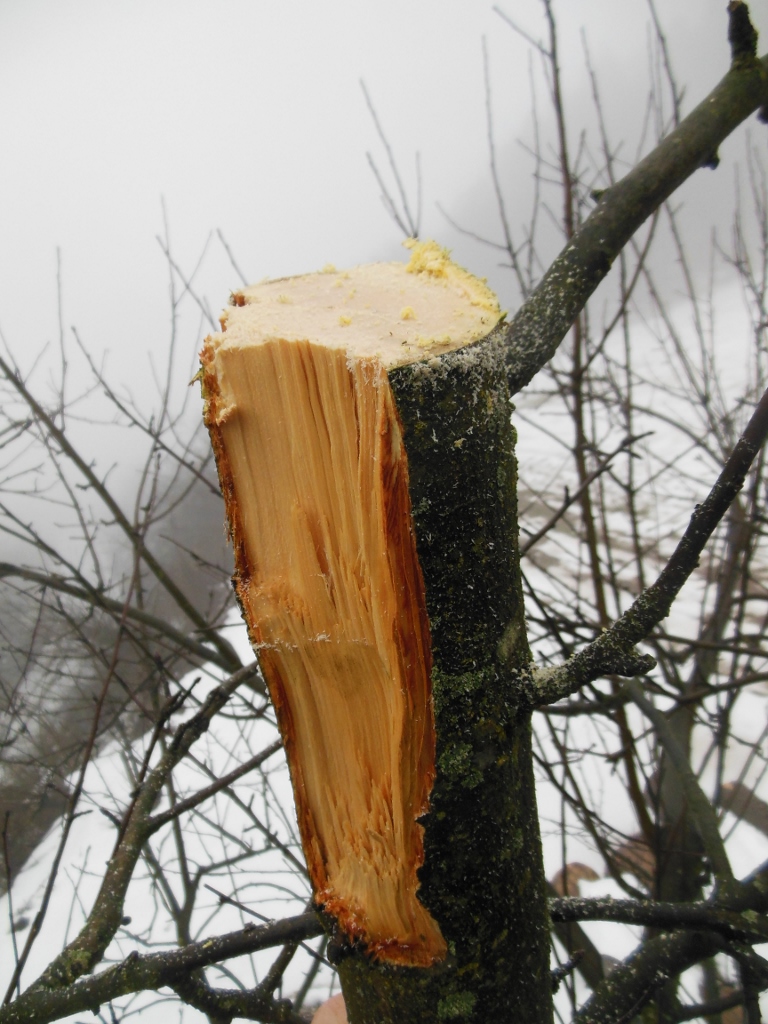 Zlomljen vrh bomo ravno odrezali z žago, z možem zgladili robove ob lubju in zamazali z ilovico. Nato bo samo poskrbelo za rast novega vrha. Ob takih ujmah se pokaže, zakaj je potrebno mladim drevesom upogibati veje in vzdrževati primerno redko krošnjo.