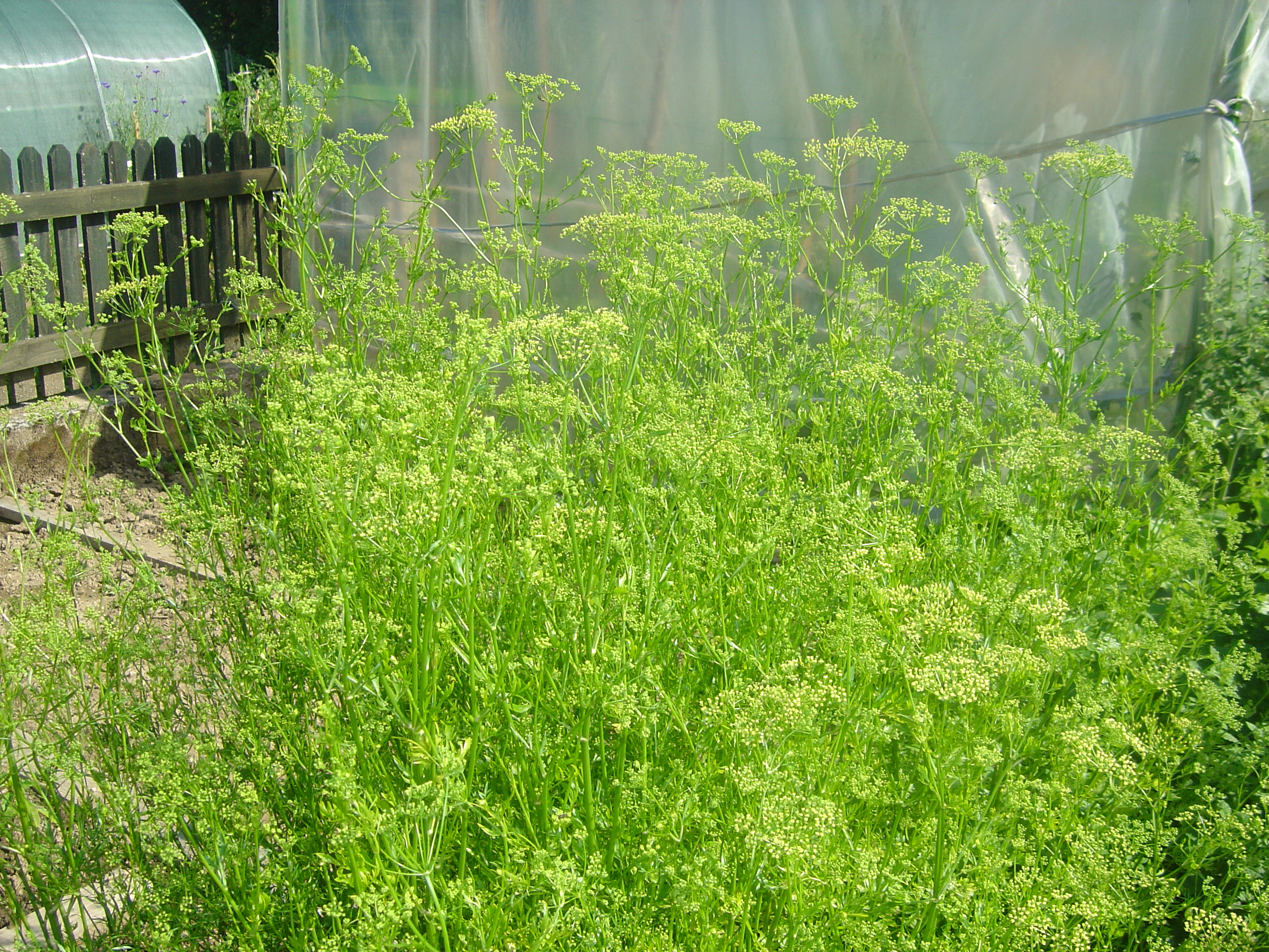 Peteršilj, ki je presajen spomladi za semenitev, v rasti nekoliko zaostaja. Sicer pa je zdrav. Do zrelosti semen bo potrebno če več kot en mesec. Nekoliko lepši in bolj bujne rasti pa je peteršilj, ki je ostal na mestu, kjer je prezimil. Vendar do zrelosti semen še manjka kakšen mesec. Vedno je tako, če korene presadimo, potem so rastline manjše in je tudi semena manj. Res pa je, da edino na takšen način lahko odberemo samo lepe, razvite korene, s tem pa vedno vršimo pozitivno selekcijo – odbiro in poskrbimo, da je kvaliteta naše sorte vedno boljša, ne pa slabša.