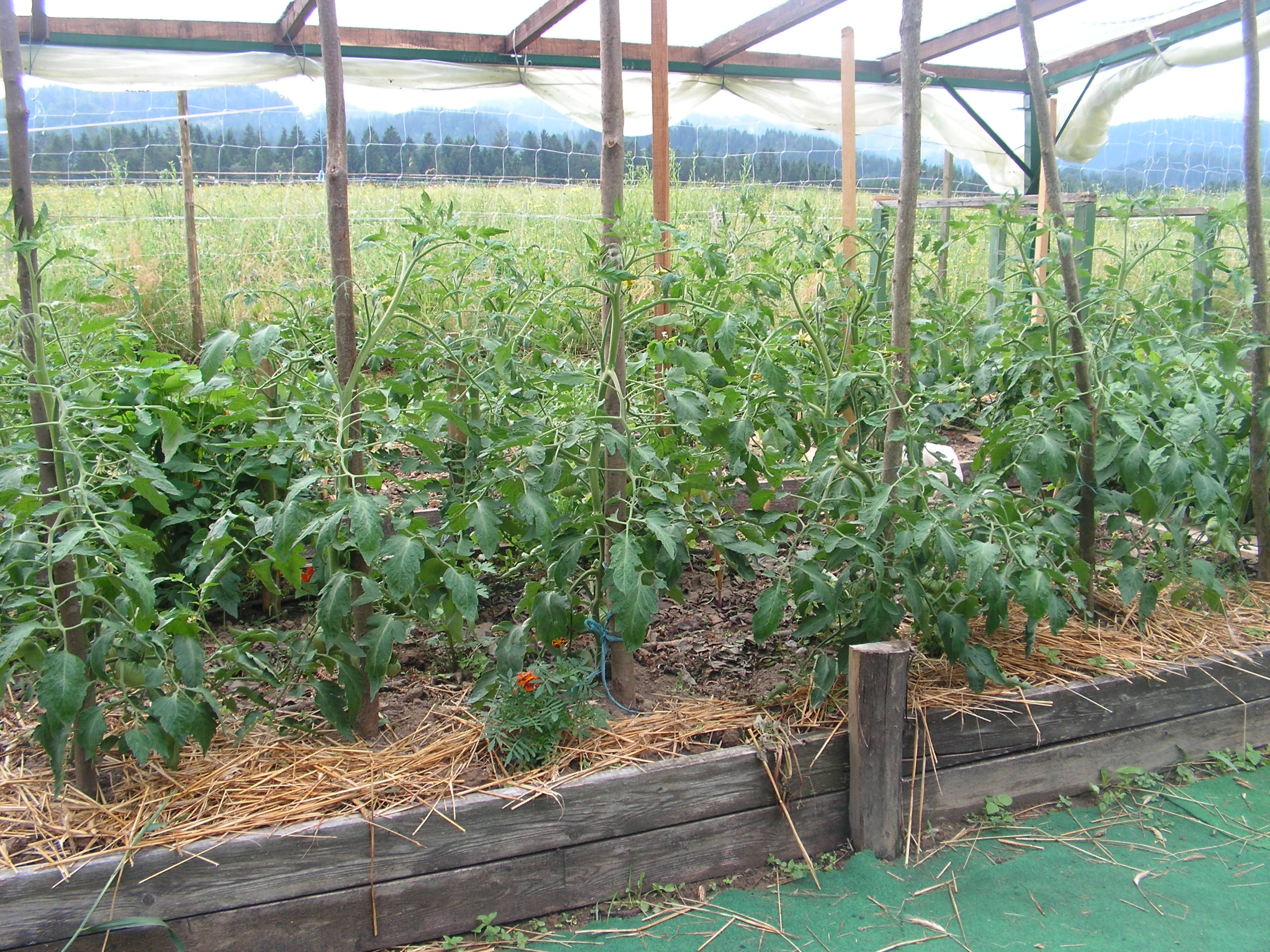 je videti zdrav, zelenje ima lepo zeleno bravo in v večini že cveti. Za seme se bodo odbirali plodovi druge in tretje etaže. Za odpornost ga lahko škropimo s čajem iz rmana, za dobro zorenje plodov zalivamo s cvetovi baldrijana, tla pa zastiramo s praprotjo ali z listi gabeza. Če tega zmanjka lahko tam, kjer ni težav s polži, tla zastremo tudi s pokošeno travo.